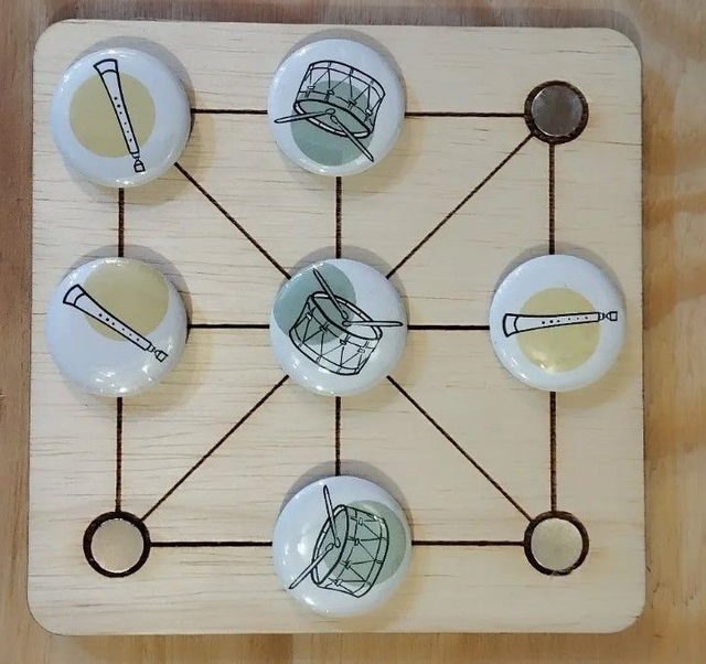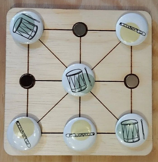 3 en ratlla de fusta amb imants d'instruments de música tradicional.