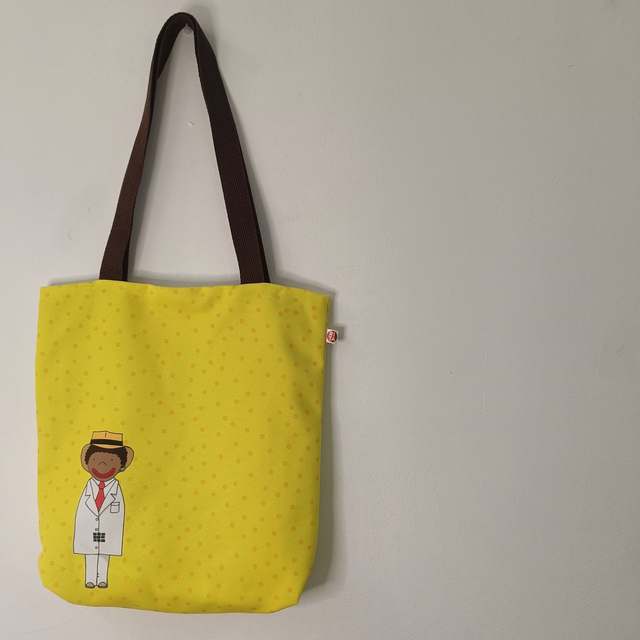 Bossa de cordes o tipus totebag gran ajustable de 35x40cm aproximadament amb forro impermeable. Rentar a 30° com a màxim, i sense lleixiu. No fer servir assecadora. Planxar a temperatura baixa.